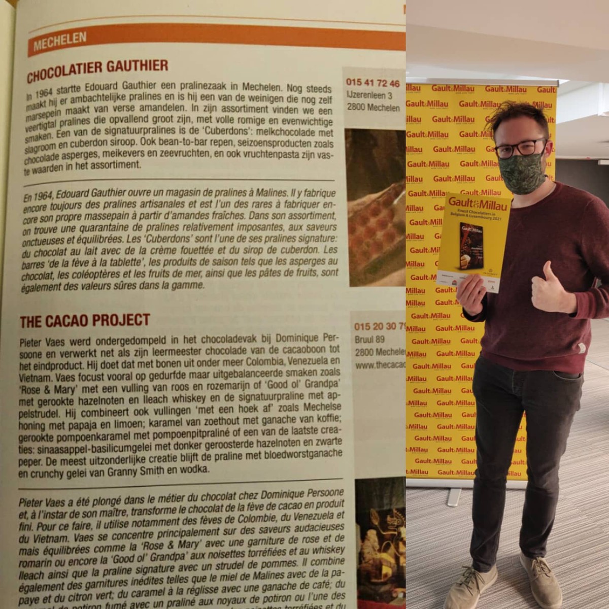 De chocolade van The Cacao Project in Mechelen wordt volledig zelf verwerkt door Pieter Vaes, chocolatier-kunstenaar met een passie voor verrassende combinaties. De pralines worden op papier uitgetekend door de mama van Pieter en komen tot leven in zijn creatieve handen. In zijn gezellige chocoladewinkel op de Bruul in hartje Mechelen verrast hij zijn klanten met klassieke pralines en gedurfde smaakbommetjes.